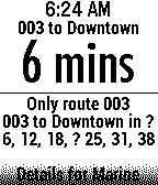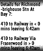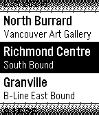 Bus schedules for Vancouver, BC. Displays scheduled departure time, with an indicator if the real-time bus is early <, late >, or unknown ?. All routes for a given stop are shown. Scrolling down gives additional details. Select up to 8 stops by ID. Includes stop ID search. Repeatedly press select button to choose your preferred route at a stop. Stop validation now turns stop number bold red if stop doesn't exist.