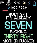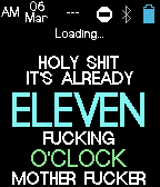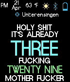 Watchface displays the time in a rude kind of way. In addition AM/PM, date, temperature, weather icon, BlueTooth Connectivity, battery state and location or steps/average steps are displayed, too. It's also possible to define a goal for your daily steps. If you enable it in the configuration page, the watchface will display your progress to achieve your goal. The bar's color will indicate the different steps of achieving your goal. - Red: You are below your average - Yellow: You are above your average - Green: You have achieved your goal The small white line shows your average steps in reference to your goal. The weather information is taken from http://openweathermap.org/. It will be updated every 30 minutes. Changelog: v1.6: spelling error corrected v1.5: Added some icons and a progress bar for daily steps v1.4: Solved BT icon issue v1.3: problem with configuration is fixes, configuration will not be resetted anymore when watchface is reloaded v1.2: now able to display daily steps rather than location via configuration page v1.1: configuration page added, temperature format is customizable now (choose between °C and °F)