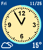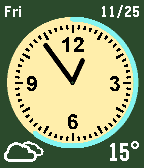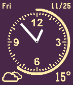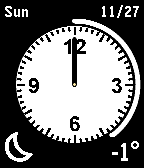 Neat analog watchface. This watchface makes use of the Weather Underground API. For the weather features to work, you will need a free and easy to obtain API key from https://www.wunderground.com/weather/api/ Select the "Stratus Plan" and "Developer" option. Features: - Analog Clock, Day, Date - Battery meter (Circular) - Alert on disconnect (Exclamation (!) and/or Vibrate) - Low battery consumption - Temperature (C/F , Standard/Feels-Like) - Accurate weather and temperature using Weather Underground API - Icon for every weather condition - Fully customizable colors and weather settings If you like this watchface, please donate and show your support by giving a ❤ Credits: - Pebble-Clay for settings menu - Danieal Vierich (http://www.danvierich.de/weather/) for weather Icons