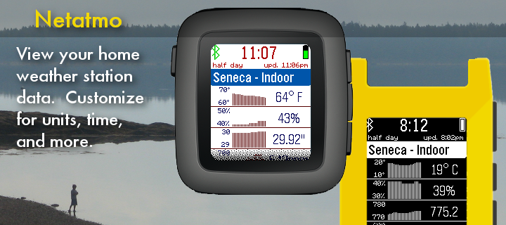 See your Netatmo home weather station readings on your Pebble smart watch. Enter your Netatmo credentials to see your temperature, humidity, and other readings. Customizable for temperature and pressure units, header format, vibration alerts, and more.