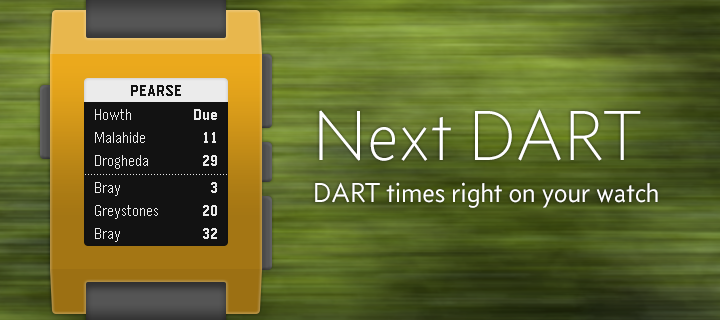 Check DART times right from your Pebble watch. Automatically displays times for your nearest DART station. Uses realtime data from Irish Rail. http://api.irishrail.ie/realtime/ DART is Dublin’s commuter rail system. http://www.irishrail.ie/index.jsp?p=122&n=182