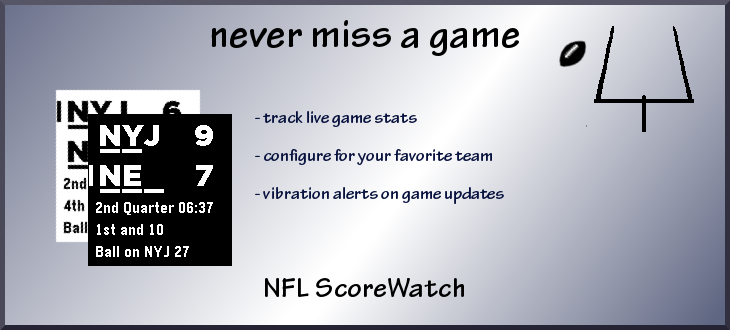 Keep up with your favorite NFL teams right on your wrist. Follow live NFL football games. Bug reports or ideas to make it better? Let me know in the forum: http://forums.getpebble.com/discussion/17152