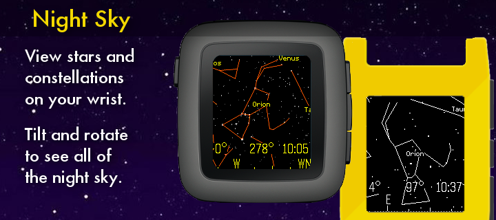View the stars, constellations, and planets of the night sky. The up and down buttons change the field of view. Click the middle button for custom settings, selecting planets, or choosing a constellation. The orientation can be set by compass, tilting the Pebble, or can be locked to a specific heading. Memory is tight, so only 1,000 stars are in black and white and 4,000 stars for the Pebble Time. Voice dictation is supported for Pebble Time watches. To use this feature, select "Voice" from the menu, and clearly state the name of a planet or constellation. Some sample terms to try are "Moon" and "Aquarius".