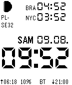 Universal Ninety Hank. Based on original version by Hank. Moonphase - Sunset / Sunrise - TimeZone - Clock - Battery - Connexion BT Configure Language, Name and offset for TimeZone 1, 2, current TimeZone and geographical coordinates for Sunset/Sunrise. Reverse screen Language : English, French, German Offset TimeZone -12/+12. Date DD/MM - MM/DD Works Off Line after first configuration.