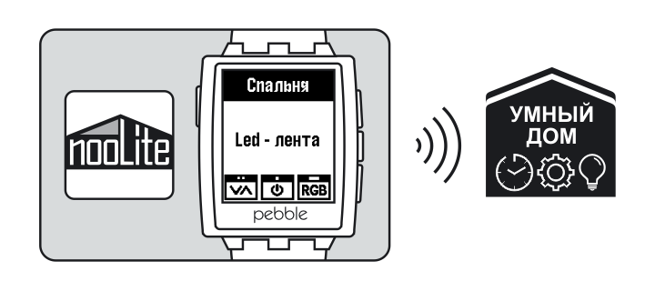 Приложение «nooLite» позволяет использовать часы Pebble в качестве интерактивного пульта, с которого можно управлять освещением. Для работы приложения необходимо подключить в домашнюю локальную сеть Ethernet-шлюз PR1132 и установить радиоуправляемые выключатели системы nooLite. Приложение на часах связывается со смартфоном, на котором установлено приложение «Умный Дом nooLite», и использует его для отправки команд управления через Ethernet-шлюз PR1132. Функции: - управление силовыми блоками системы nooLite; - отображение информации с датчиков температуры/влажности; - возможность управлять яркостью и цветом светодиодной ленты. Более подробно про систему радиоуправления nooLite можно прочитать на сайте www.noo.com.by