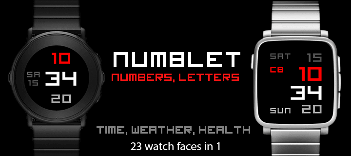 Free! --- NUMBLET, numbers and letters. --- + LOOK STYLE: 23 different watch face styles composed by Numblets. Numblets: 1:Hour, 2:Minutes, 3:Day, 4:WeatherTemperature, 5:DistanceWalked, 6:StepCount, 7:KCaloriesBurned, A:Bluetooth/BatteryStatus, B:MonthOfYear, C:DayOfWeek, D:WeatherCondition + HIGHLIGHT COLOR: 10 different highlight colors + NIGHT COLOR: Choose alternative color used at night or when low ambient light. + WEATHER COLOR: weather temperature and/or weather condition colored. (look at last screenshot animation to learn the weather color coding) + HIGHLIGHT MINUTES instead of HOUR: Yes / No + BLUETOOTH STATUS INDICATOR: C/D connected/disconnected. Shown always or when disconnected only (depending on LOOK STYLE). + BATTERY CHARGE INDICATOR: 0..9 (0%..90%), F(Full 100%). Shown always or when charge below 20% only (depending on LOOK STYLE). + VIBES ON DISCONNECT/RECONNECT: Yes / No + WEATHER UNITS: Temperature in Celsius or Fahrenheit. + DISTANCE UNITS: Walked distance in Kilometers or Miles + TIME FORMAT (12, 24) (Detected from Pebble watch settings) + LANGUAGES (English, Spanish) (detected from Pebble) + WEATHER CONDITION LEGEND: -(english) SUN:Sunny, CLR:Clear, PCL:Partly-Cloud, CDS:Clouds, RAI:Rain, THN:Thunderstorm, SNW:Snow, FOG:Fog -(spanish) SOL:Soleado, CLR:Claro, PNU:Parcialmente-Nublado, NUB:Nublado, LLU:Lluvia, TOR:Tormenta, NVE:Nieve, NBL:Niebla (some LOOK STYLEs use 2-letter only) Designed and developed by dP-faces https://dp-faces.com/ --- Get the Premium Pack for a great price — it includes all current paid watch faces and any future ones I release. Thanks so much for your support! ❤️ https://bit.ly/dp-pebble