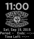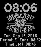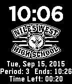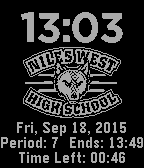 A watch face that displays the current period and when it ends on the regular bell schedule at Niles West High School. User Guide: "Period", along with stating numbers that correspond with the current period, also states letters for other indicators. B = Before School E = Early Bird H = Home Room A = After School The watch face does not show passing period. As soon as one period ends "Period" will state the period of your next class, to remind you of your destination. On weekends "Period" will show "-" which indicates that there is no current period. After school and on weekends "Ends" and "Time Left" will show "--:--" to indicate that there is no period to end.