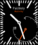 Track your activity with this simplistic watchface. Configure either steps or activity time and set up your individual daily goal. The extra dial schows your today's achievement from 0 to 100 percent. Choose one of the different color styles. Switch bluetooth connection status on or off, additionally enable buzzer. The status is shown by a tiny arrow pointing to 100% (connected) or 0% (disconnected). Enable battery status: Another small hand moving between 0% and 100%. If you like, make the small scale thicker. Seconds Hand can be enabled as well as (color-) filled hands.