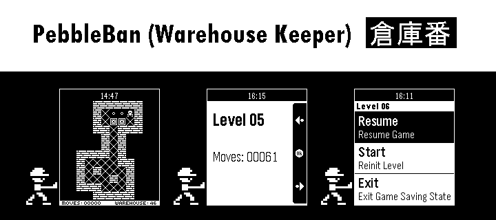 Play 'PebbleBan', the great classic Soukoban (Warehouse Keeper) in your Pebble. Including these nice features to provide a joyful experience: - 50 small levels - UNDO - Save State Do you dare to tidy all 50 warehouses? Can you achieve it in fewer movements?