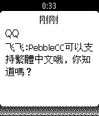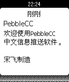 Display Chinese Message on pebble for iOS system. Any App Notification Message support. 可以将 iPhone上的通知信息发送到Pebble手表显示。 支持任何App的消息推送。 支持上一条,下一条消息翻页。 详细信息请看帖子: http://forums.getpebble.com/discussion/13526/watchapp-pebblecc-pebble-chinese-coming-for-ios