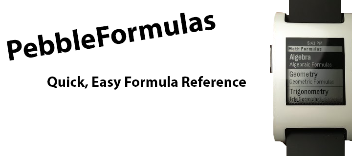 PebbleFormulas agora em portruguese! Uma maneira rápida conveniente de acessar muitas fórmulas para álgebra, geometria, trigonometria, cálculo, Biologia, Física, Química, conversões e eletricidade! Atualizações serão comuns, adicionando novos recursos, fórmulas e surpresas! Tradução graças a Lucas Farah! Translation thanks to Lucas Farah!