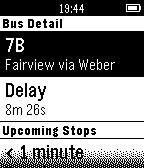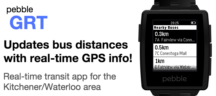 Check real time bus times and distances for GRT in the Kitchener/Waterloo area! - Click on a Nearby Bus to see Delay and Upcoming Stops - Click on a Nearby Stop to see Upcoming Buses