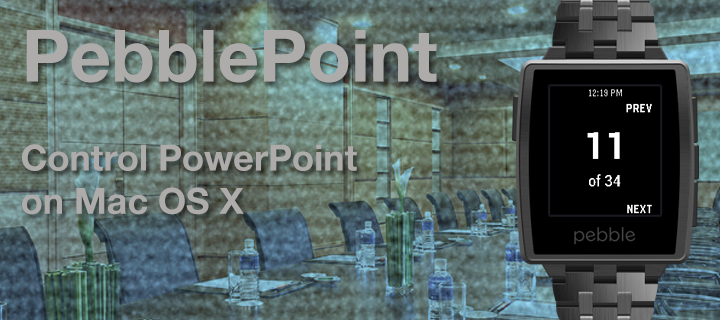 Control Microsoft PowerPoint on Mac OS X from your Pebble! Use the buttons to go to next/previous slides, or press and hold for last/first. Requires: - Mac OS X - Microsoft PowerPoint Download and run PebblePointServer.app. https://db.tt/nvHQZmPg Or, if you're more technical you can install the Node.js package, pebblepoint_server, which is much slimmer.