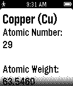 I created this app hoping it would help students, scientists, and anyone interested in science learn/have a reference of the periodic table of elements. Color version coming soon for Pebble Time! If you believe I made any mistakes in the app, please don't hesitate to contact me, I don't want to be giving anyone false information! Also contact me if you have some improvements you think I should make. :) Thanks.