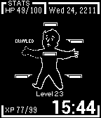 Simplified version of PIP BOY 100 by Bert de Ruiter using a cleaner background picture, no accelerometer-XP interaction, and no shake to slide in weather. HP is the battery level, XP is the temperature in F, top right is date (static year) and bottom right is time. Upon BT disconnect the right arm cripples. Has 12h and 24h modes based on Pebble settings. Inspired by Fallout's Pip Boy. Built from SDK tutorial examples, designed first in Canvas long ago and posted on Reddit.