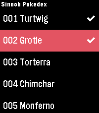 Keep track of your captured Pokémon from the Generation 4 games right from your wrist. Featuring the complete set of all 493 Pokémon from the Platinum version. Track both the Sinnoh region and the National Pokedex.