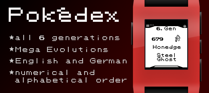 A Pokédex-App including all 721 Pokémon from all generations plus Mega Evolutions. Features: - English and German name (configurable), types, number and generation of every Pokémon. - Sort the Pokémon by number or by English or German alphabet. - Images of all Pokémon. - Little symboles for legendary Pokémon and Pokémon with Mega Evolution. Controls: - Up (hold): step 1 (25) Pokémon backward - Down (hold): step 1 (25) Pokémon forward - Press Select: toggle language/Mega Evolution - Hold Select: random Pokémon - Press Select on "Pokémon 000" to change order This app is based on the Pokédex by shutdown27 and the Pokédex by DKote with friendly permissions. Feel free to comment this app: https://jascosius.de/projects/pebble-pokedex/