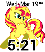 A random pony image out of 70 is displayed per minute; along with the time, date, and a battery meter. Watchface can be white on black or black on white.
