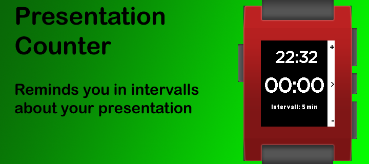 Start a presentation and the app will remind you in configurable intervalls via short vibrations how much time has elapsed 1 vibe: intervall has passed 1st time 2 vibes: intervall has passed 2nd time 3 vibes: intervall has passed 3rd time 1 vibe: intervall has passed 4th time and so on