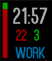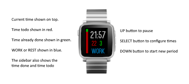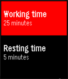 Slice your time with TimeSlicer. Whether you are working or working out, it's important to keep focus and to have regular breaks. TimeSlicer warns you when it's time to have a break, and time to start working (out) again. After the configured time (by default 25 minutes) your Pebble will vibrate, telling you it's time to have a break. Stay focused until your Pebble vibrates. No more looking at your watch again. When resting time is over (by default 5 minutes) your Pebble will vibrate again. Back to work. Working time and resting time can be configured up to 99 minutes. Use SELECT button to configure the times. Use the UP button to temporarily pause the time. Use the DOWN button to quickly switch to a new work or rest period.