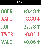 Displays your current stock quotes. Now in colour! Supports multiple stock quotes and displays up to 5 stocks per screen (up/down buttons to switch screens). Automatic stock updates can be enabled in the settings, including automatic rotation between screens and values (current, absolute and percent change)