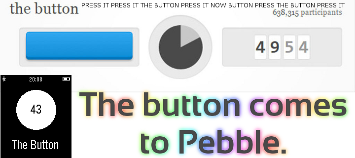 Since /r/thebutton has ended, I have disabled this app for now. It may be repurposed at a later date for something else. The button comes to Pebble! A simple app that shows the current time in a circle. Uses pebble.js and emtes' button.mtsanderson.com API. Updates every 2 seconds or when select button is pressed. More features coming soon, such as: More reliability Better timer (1/10s, less lag) Rewrite to C Menu with button stats
