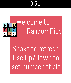 Random Pictures will show random pictures in your Pebble. You can use this app for story tell games and stimulate yourself with random idea.