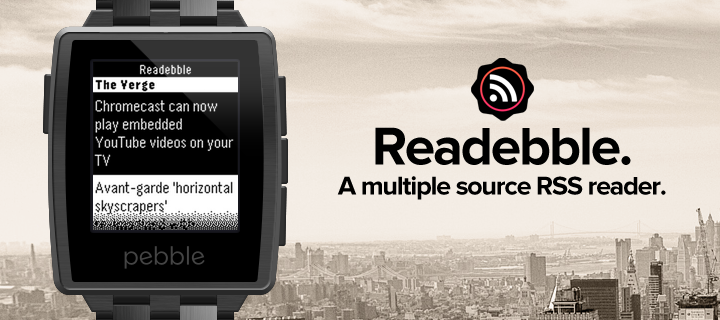 A multiple source RSS reader for Pebble that allows you to read the headlines of your favorite feeds and a summarized story for each headline. *NEW: Pocket support. Add items to your Pocket by simply holding the select button. Add any kind of RSS feeds such as news, reddit, emergency feeds, GitHub news feed, Pebble blog, etc. Thanks to John La Motta for the idea and graphics!