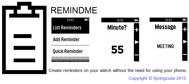 This Pebble watch app allows you to set reminders on your watch without the need to access your phone. When it is time the reminder vibrates the watch, turns on the light and shows the reminder.