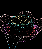 An interactive 3D math function demo. *** BUTTONS *** UP : colorization (Monochromatic,Distance). SELECT: pattern (Dots,Lines,Stripes,Grid). DOWN : oscillator (Anchored,Floating,Bouncing). long UP: illumination (Diffuse,Spotlight) long SELECT: transparency (Opaque,Xray,Translucent) long DOWN : detail (Coarse,Fine) Coarse detail (faster): shadow and color change frontiers snap to the nearest control point in the active pattern grid. No anti-aliasing is applied. Fine detail (slower): shadow and color change frontiers are approximated to no more than 3 pixel error. Anti-aliasing is applied.