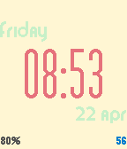 A simple digital watch face with a nice big font, a battery percentage and seconds ticking away in the corner. Everything I need with a little splash of colour. You can now choose the colours for the background, the time, date and day (together) and the seconds.