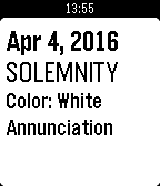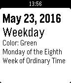 This app shows the current day of the Roman Catholic Liturgical Calendar. Click up or down to go back or forward a day, and click the menu button to return to the current day. Data taken from http://www.romcal.net/