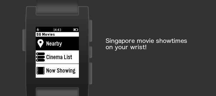 SG Movies brings you the latest movie showtimes in Singapore. You can now easily get the list of nearby cinemas and today showtimes from your Pebble watch! Please email me at [email protected] for any bug reports or suggestions. Note: This app is built with PebbleJS beta SDK, it requires bluetooth connection between Pebble and phone, as well as Internet connection.