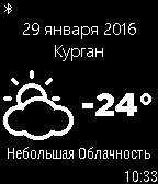 Just another watchface for Russian users ~~~~~~ • Текущее время, день недели и дата на основном экране. • Погода по данным OpenWeatherMap или Weather Underground на дополнительном экране (активируется встряхиванием). • Индикация состояния соединения с телефоном, уведомление вибрацией о его потере. • Индикация низкого заряда батареи.