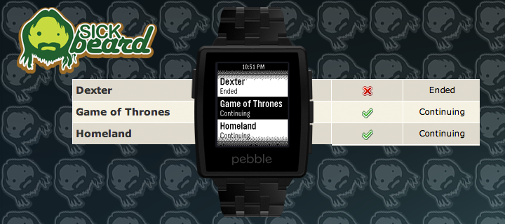 Control SickBeard from your Pebble! Features: - Configurable to your liking - View Shows in SickBeard (With Status) - View Upcoming/Future Shows (With Time, Day, Date) - View History (Downloaded and/or Snatched) - Force Backlog - Restart SickBeard - Shutdown SickBeard Coming Soon: - View Episodes for each Show