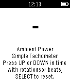 This allows you to time RPM or BPM by pressing UP or DOWN in time with the event. The program averages up to ten of the most recent timings. Suitable for RPM/BPM of between 2 and 270. Program was written to allow for simple verification of turntable speeds during development of a new product, but could be applied to many different uses. Be aware that accuracy is dependent upon you ability to press button in time with event! Pressing SELECT starts the program and timing again.