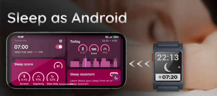 Sleep as Android Alarm clock with sleep cycle tracker now fully integrated with Pebble. Comfortable wrist-tracking though Pebble's build-in accelerometer. Wakes you in optimal sleep phase with a silent vibe-alarm. Remote pausing, snoozing, dismiss. Battery optimized - weeks of battery life with 8h sleep daily.