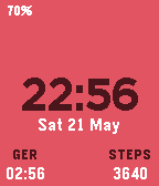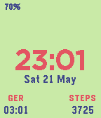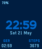 Simple, customizable, low power usage watchface. Match your pebble to what you're wearing every day. A simple shake of your hand unveils for 2s the battery charge, a customizable, second timezone and the steps you've been taken.