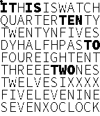 A modified WordSquare watch face (by Hudson and Jnmattern) to support tap gestures for displaying basic info. Bluetooth = "X" at the bottom of the screen if disconnected Battery level = Squares on the right side of the screen Day of the month = Digits at the left side of the screen Some settings are configurable via the Pebble phone app.