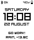 This version of smartface is deprecated! If you want to use this watchface, please, use new version. You can find it in Pebble store as "SmartFace TimeLine" === Functional watchface with a high degree of customization! features: - Display date, time, weather, text string, BT and battery state - Vibrate every hour, when BT connection lost and when charging - Wide opportunities for customization: you can off almost every interface unit - It looks stylish and simple