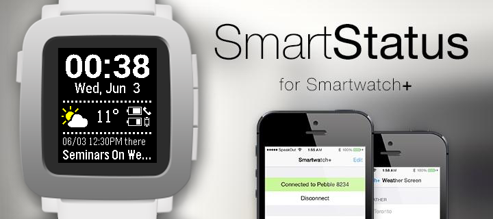 Display the current weather alongside the iPhone's and Pebble's battery level, the current/next calendar appointment, and the currently playing song from your iPhone's iPod music player. This watch app only works in conjunction with the Smartwatch+ iOS app, which is available in the App Store.