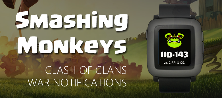 SmashingMonkeys Pebble notification app. The Clash of Clans companion you've always wanted! War score notifications right to your wrist. No need to break out your phone! (companion app not necessary to retrieve scores. companion is necessary to receive alerts) NOTE: This app only works for the clan SmashingMonkeys