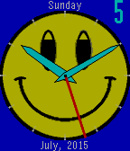 Have A Nice Day as you keep track of the time. Smiley face watch will be sad when Bluetooth is disconnected. Options to set eye color for different battery levels. Show Hour numbers and have eyes close as battery level goes down.
