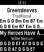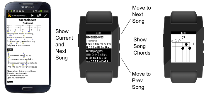 Links with SongBook Android or iOS to show current and next song title, subtitle and chords. Use Select button to view chord definitions for current song. Move to previous/next song in the SongBook app with the Up/Down buttons.