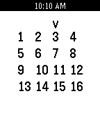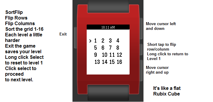 A puzzle game that requires you to flip rows and columns to sort the grid 1-16. The game progressively gets harder, in fact it may get too hard. I can't get past level 5) 1234 flipped 4321 Use top and bottom buttons to move cursor. Use select to flip and to go to the next level. Long press select to return to level 1