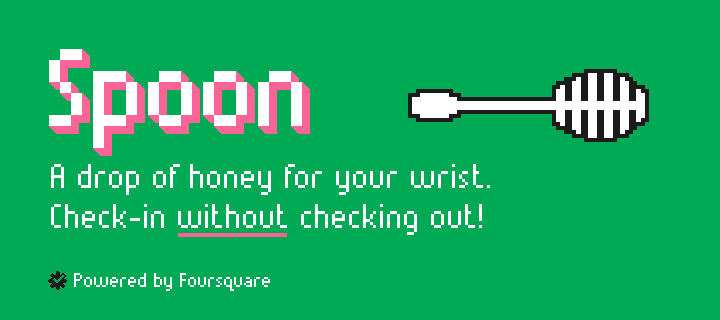 Spoon is a simple Foursquare/Swarm check-in app for Pebble. The watchapp lists nearby venues using your phone's GPS location. Pick a venue and check-in. All from your wrist. Español Spoon es un app simple para Foursquare y Swarm. Usando el GPS del su celular para listar los lugares cercano. Elige uno y haz "check-in" desde tu pulsera.