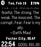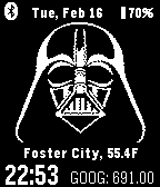 Displays current date, time, stock, weather and location information. Vibrates when bluetooth connection lost. Bonus: tap your watch and read quotes of the greatest Sith Lords of All Time.