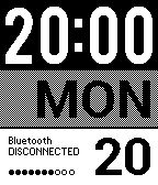 2015.5.9.Updated Ver 2.4: bug fixed. The display shows current time ,day of the week,day, battery level indicator. If Bluetooth connection-loss from smart phone, then display "Bluetooth DISCONNECTED" on the screen and vibrates. Three screenshots show: 1.battery100% 2.battery 70% and Bluetooth disconnected 3.battery 70% and battery charging You can buy other version from website link.(Delete Bluetooth disconnected vibration version, Added function to vibrate every hour version)