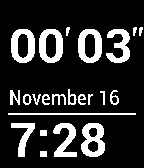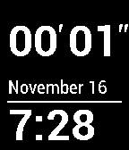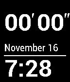 Counts minutes and seconds from the instant the watchface is selected. The current date and time are displayed below.