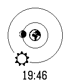 The Sun and Moon circle earth as in ancient Geocentric model. The moon position indicates minute, the sun position indicates hour, lunar phase indicates battery percentage, sun appearance indicates the bluetooth link status. Date and time is shown in the bottom line.